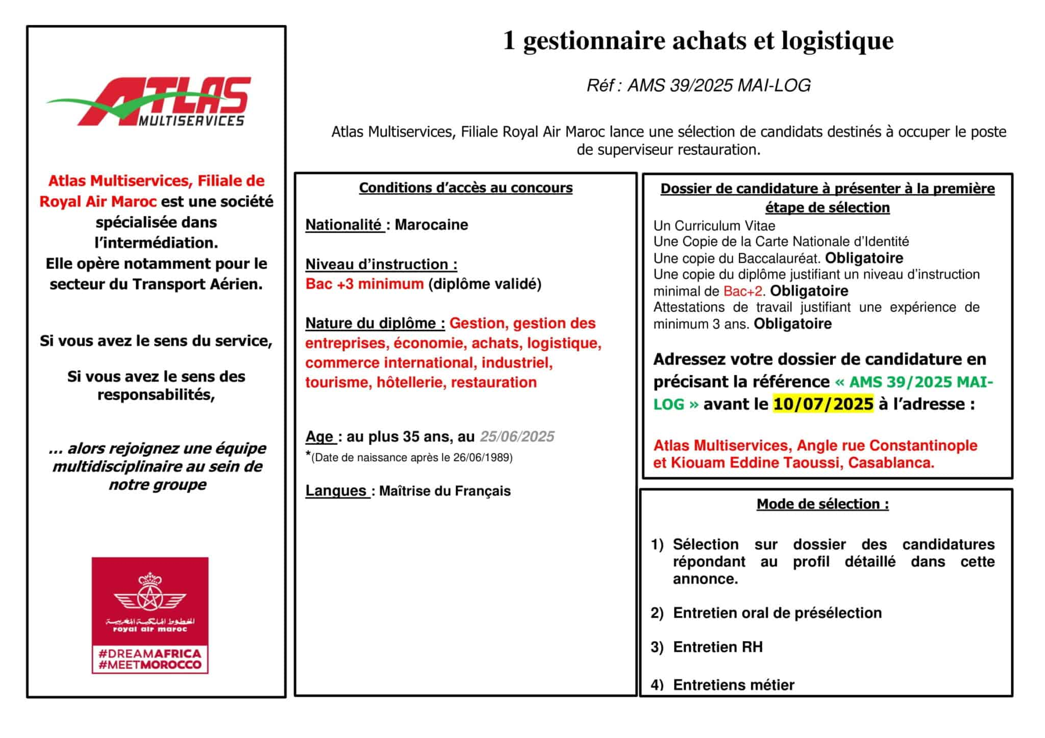 Dans le cadre de l’expansion de ses activités et du renforcement de ses services, Atlas Multiservices, filiale de Royal Air Maroc spécialisée dans l’intermédiation, lance une vaste campagne de recrutement pour pourvoir 14 postes dans diverses spécialités techniques et administratives.